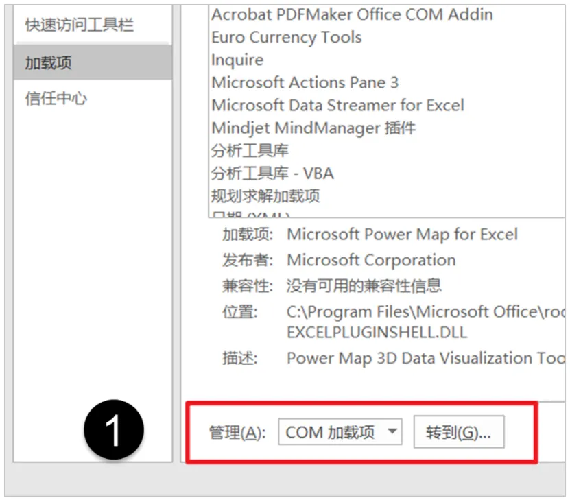 步骤1:在Excel的“文件”选项卡中选择【选项】,出现的对话窗中左边选择【加载项】,右侧窗口选择【管理:COM加载项】,然后点击【转到】按钮。