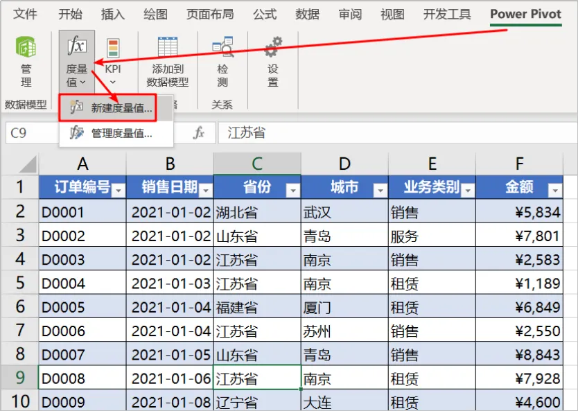 退出Power Pivot窗口后,点击“新建度量值”
