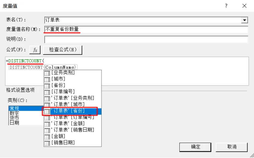 =DISTINCTCOUNT('订单表'[省份])