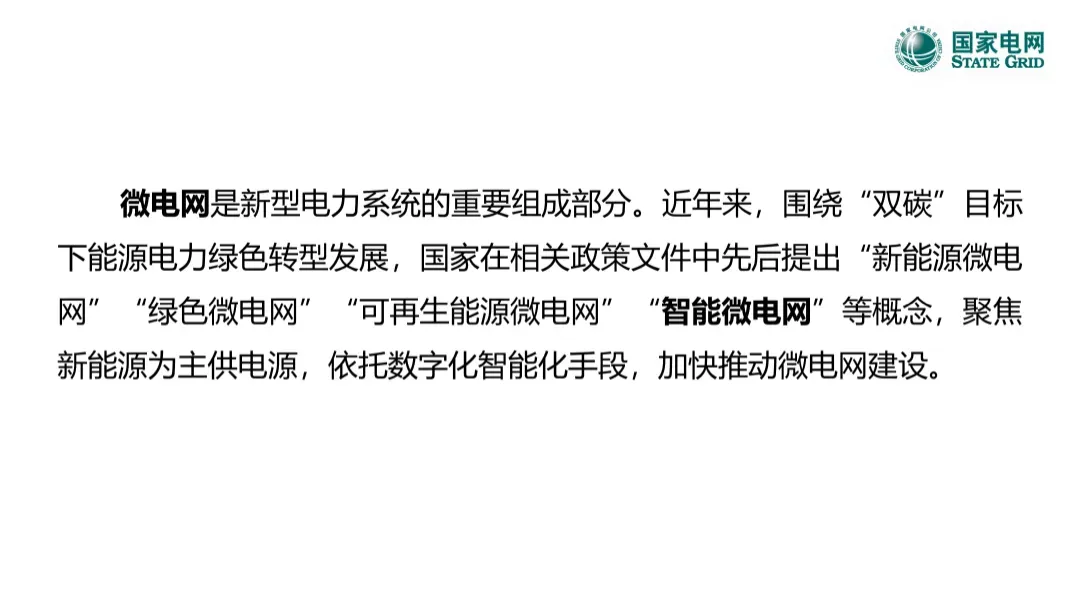 微电网是新型电力系统的重要组成部分。近年来,围绕“双碳”目标下能源电力绿色转型发展,国家在相关政策文件中先后提出“新能源微电网”“绿色微电网”“可再生能源微电网”“智能微电网”等概念,聚焦新能源为主供电源,依托数字化智能化手段,加快推动微电网建设。