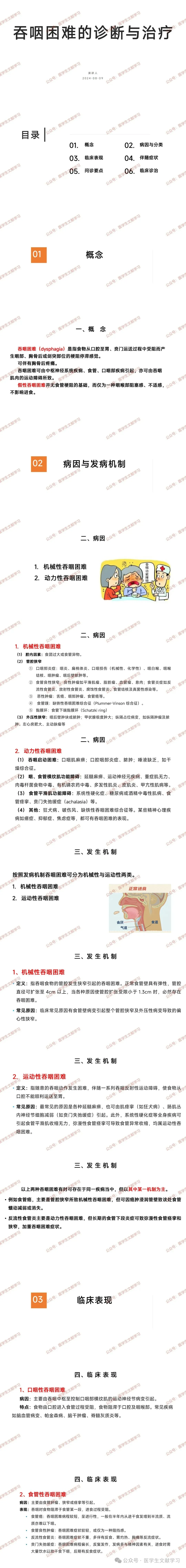 概念:吞咽困难是指食物运送过程中受阻而产生的梗阻停滞感觉,可伴胸骨后疼痛,可由多种疾病或吞咽肌肉运动障碍引起,假性吞咽困难无食管梗阻基础,仅为咽喉部阻塞感。