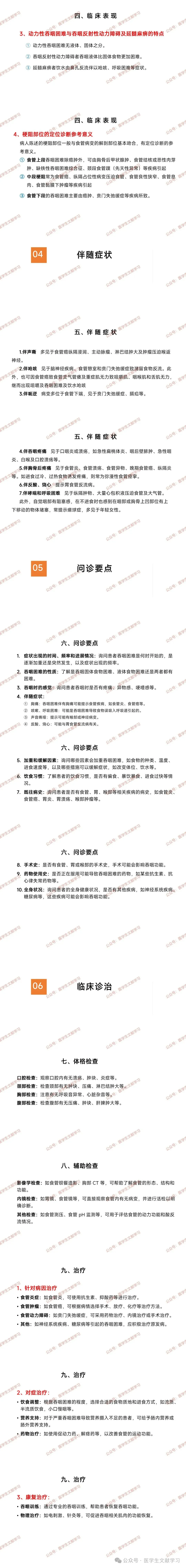 问诊要点:包括症状出现的时间、频率和进展情况,吞咽困难的性质,吞咽时的感觉,伴随症状(胸痛、咳嗽、呼吸困难、声音嘶哑、反酸、烧心等),加重和缓解因素,饮食习惯,既往病史,手术史,药物使用史和全身状况。