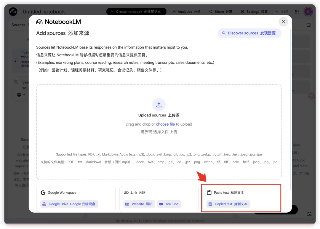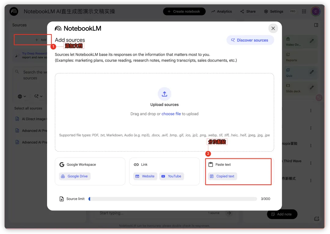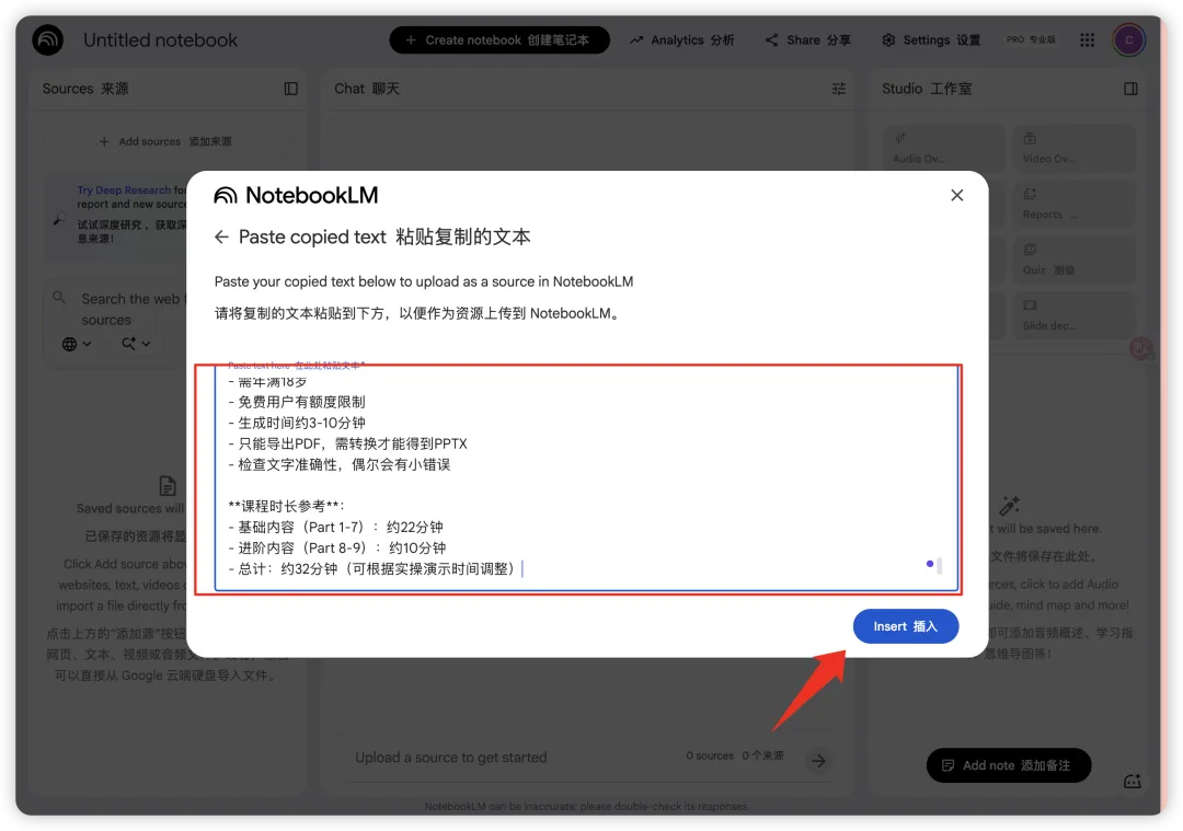 生成的逐字稿复制下来,直接粘贴到NotebookLM的素材区。