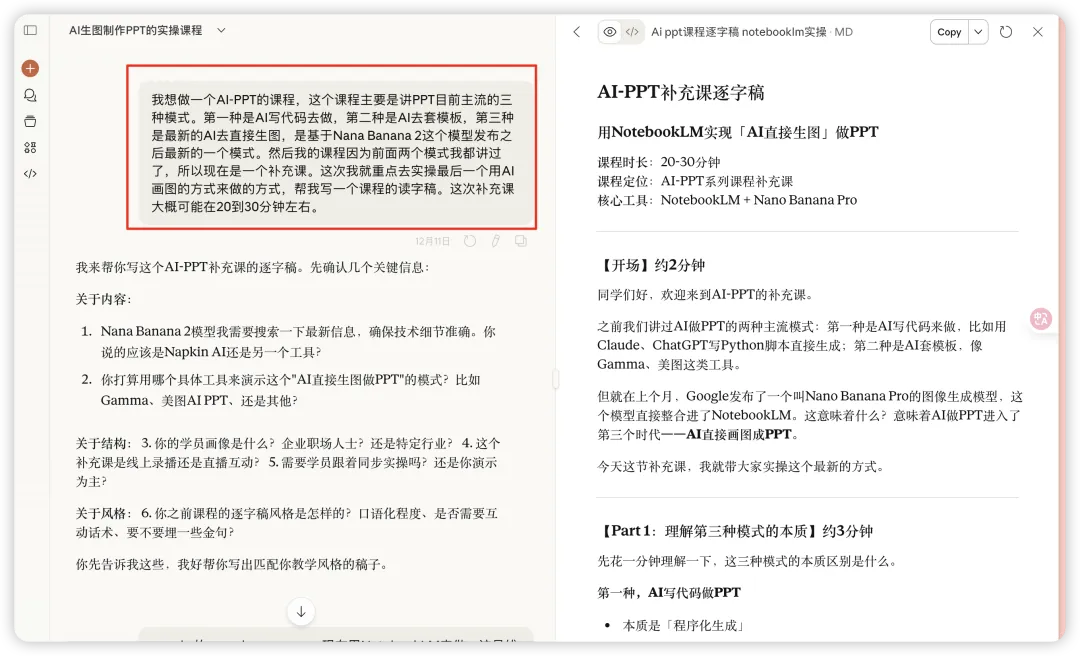 我的做法是:先让AI生成逐字稿,再用逐字稿生成PPT。