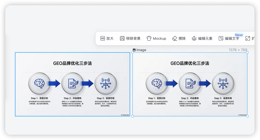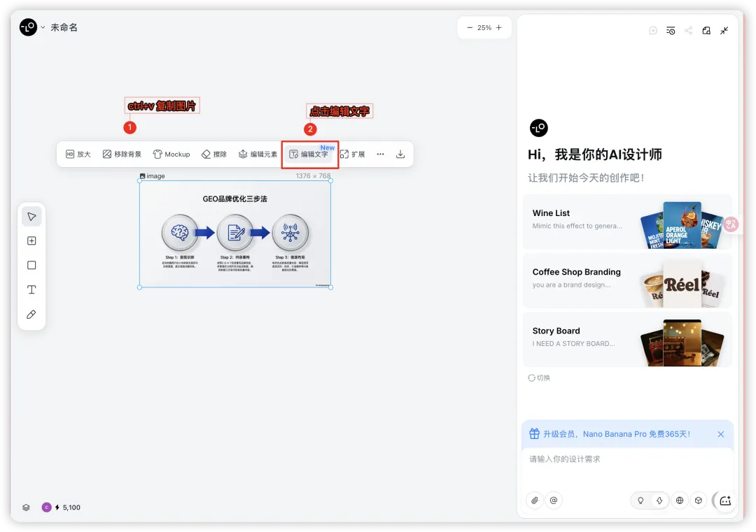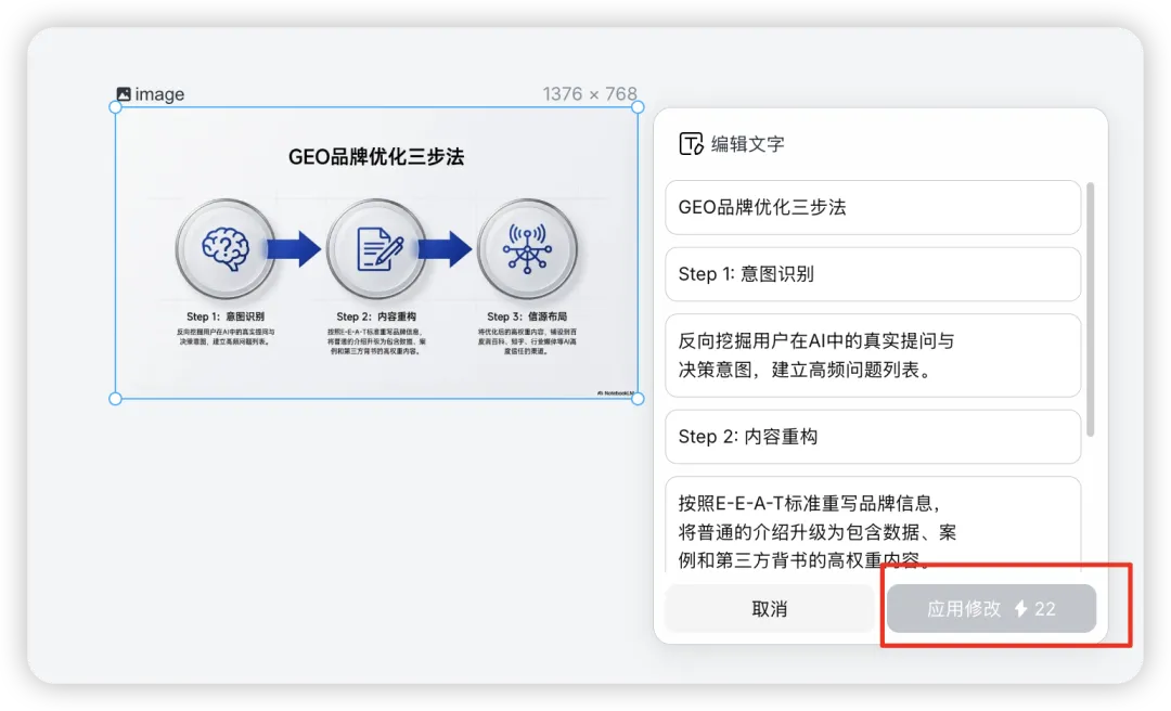 所以如果 AI 生成的很多乱码,请重新生成一版,选择乱码少一点的版本,然后再进行修改,否则后续的修改工作将会非常繁琐。