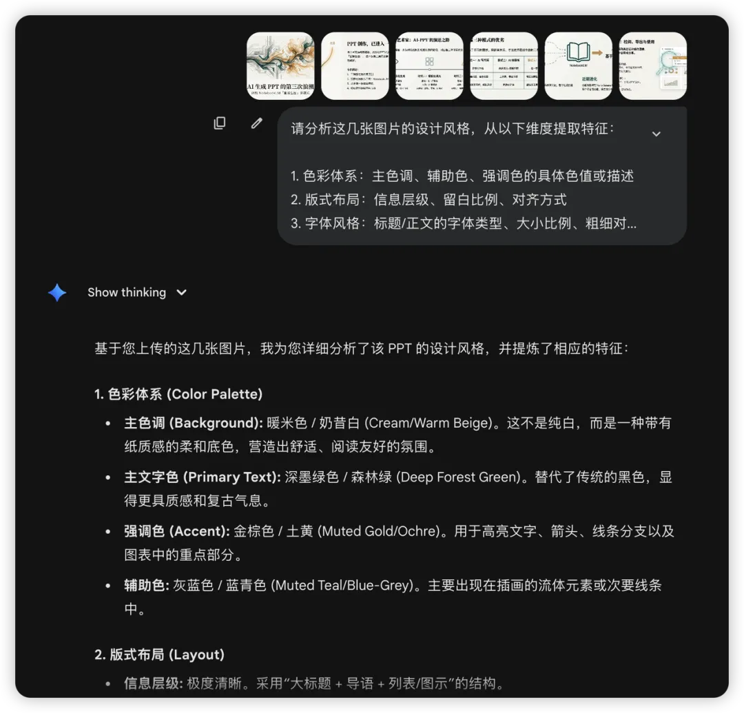 实际效果:比如我上传了几张极简商务风的PPT,AI生成了这样的提示词: