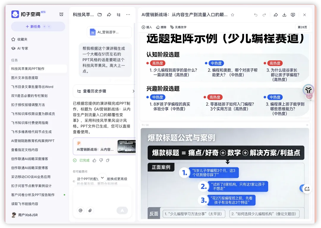 这时候再生成PPT,出来的内容就是按照你的逐字稿结构来的,和你想要的高度一致。