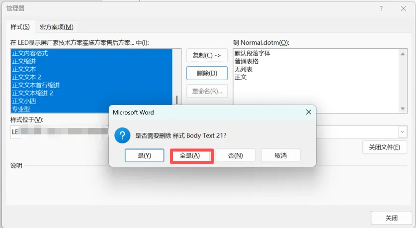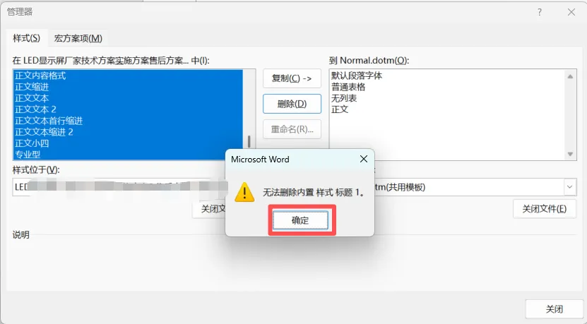 3、我们点击第一个样式,然后拖动滚动条到最后,按住shift,点击最后一个样式,这样就能全选所有的样式;4、等待片刻,会弹出提示 无法删除内置样式,全部点击 确定,然后,我们点击关闭管理器窗口,再打开样式库,就会发现多余的样式已经被清除了。