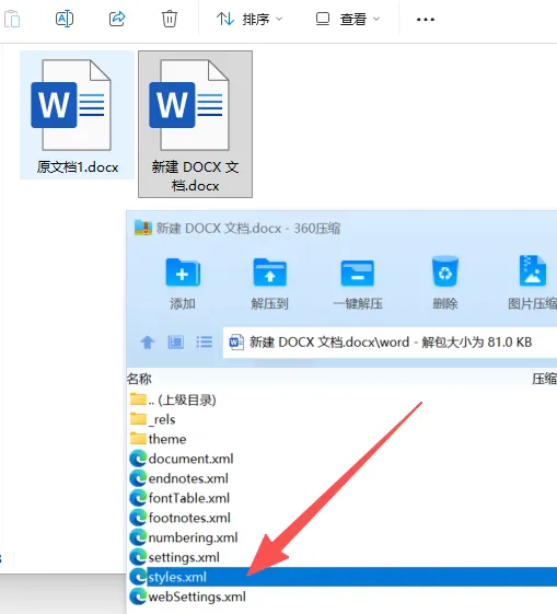 2、鼠标右键点击新建文档,用解压工具打开,找到word文件夹中的styles.xml ,复制;