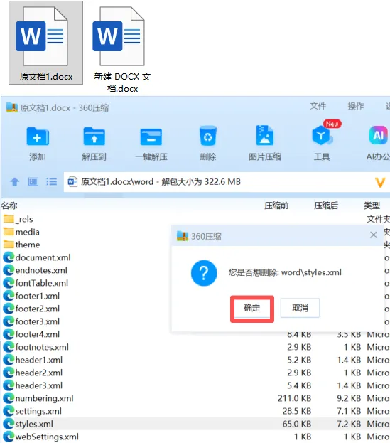 3、再用同样的方式,鼠标右键点击原文档用解压工具打开;找到word文件夹中的styles.xml 并删除; 然后把刚才复制的新建文档的styles.xml粘贴进来。4、完成之后,再重新打开原文档,就会发现原文档中多余的样式都被删除掉了。这样看着就舒服多了,也方便后面的继续编辑和调整了。