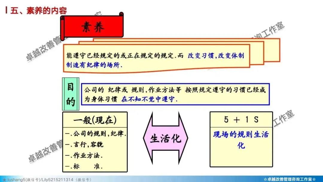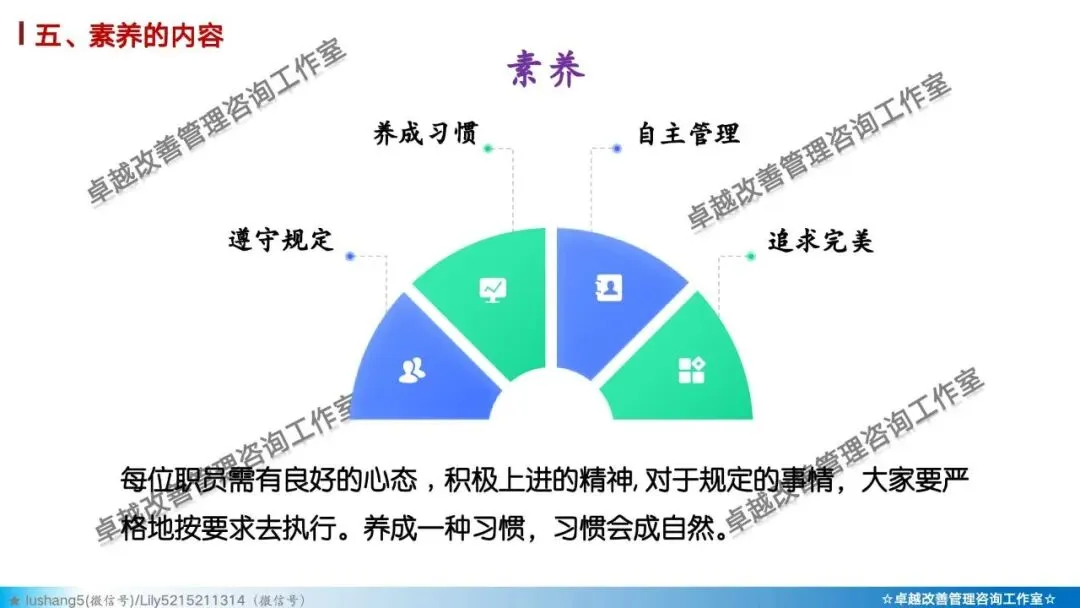 “素养”是5S的终极目标和核心。它不仅仅是前4个S(整理、整顿、清扫、清洁)执行的结果,更是一种养成习惯、形成文化的状态。