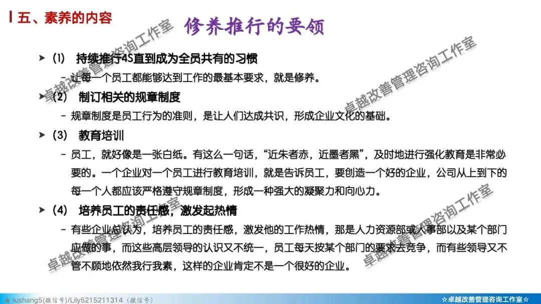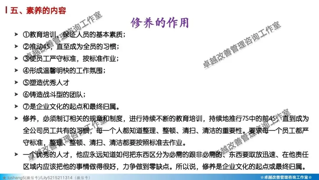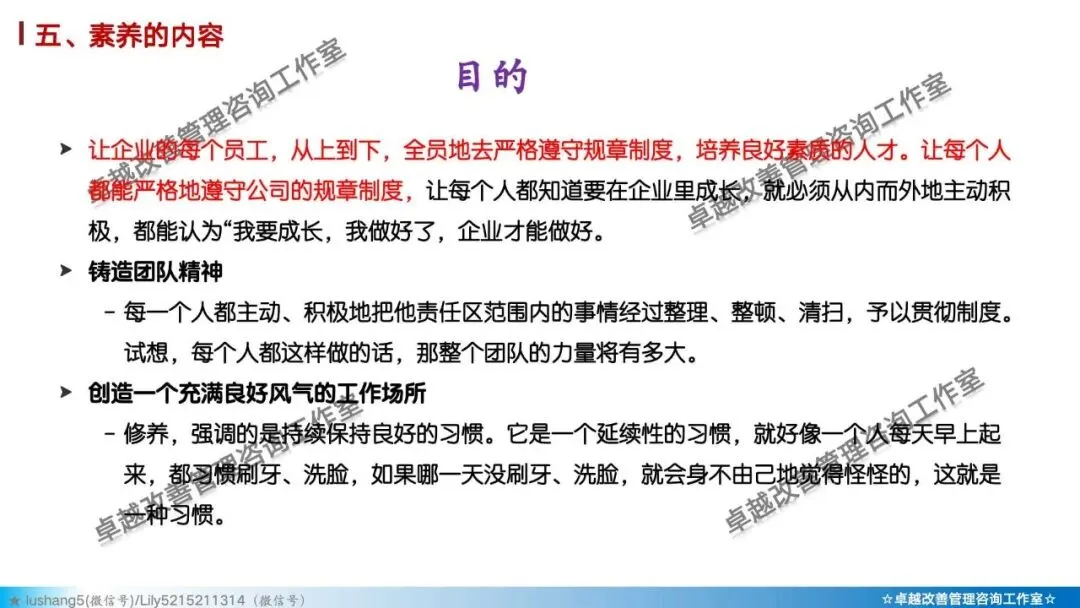 打造企业文化的基石: 是形成“精益文化”、“持续改进文化”的起点。一个拥有高素养团队的企业,其执行力、创新力和凝聚力都会大大增强。