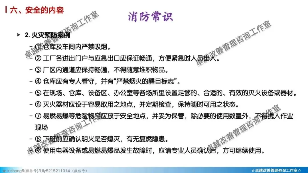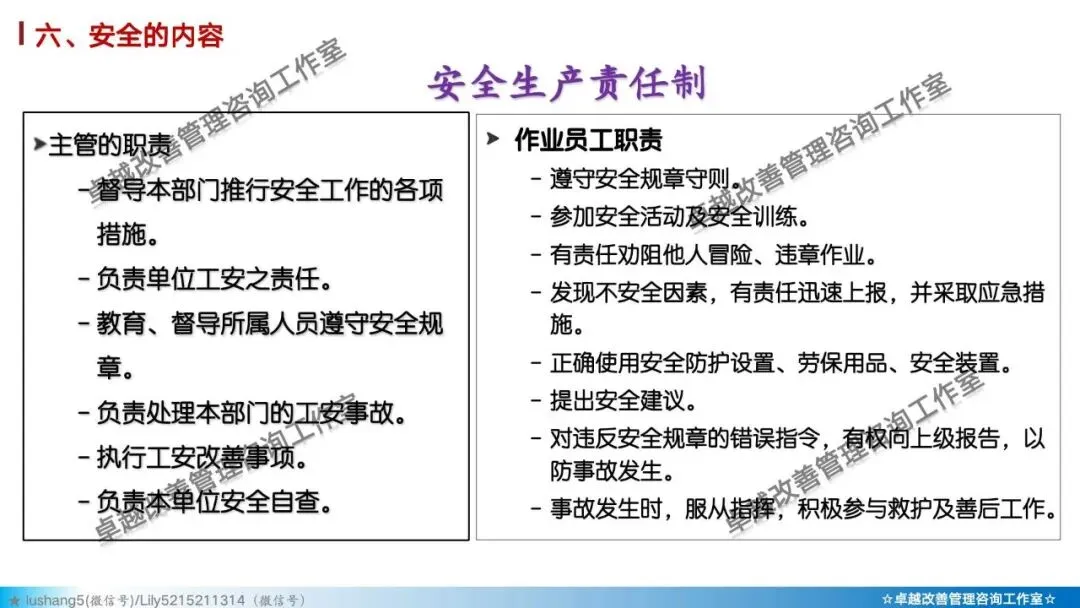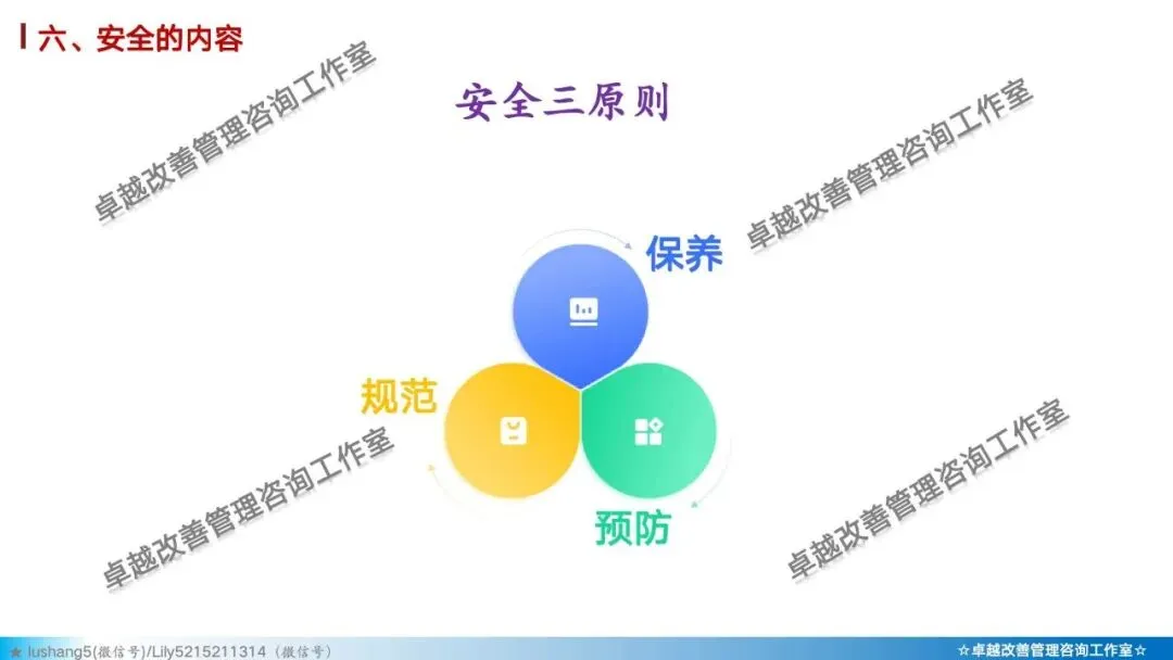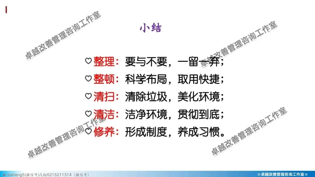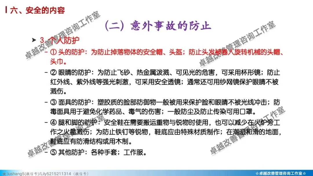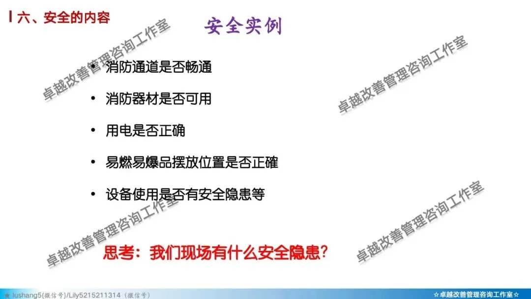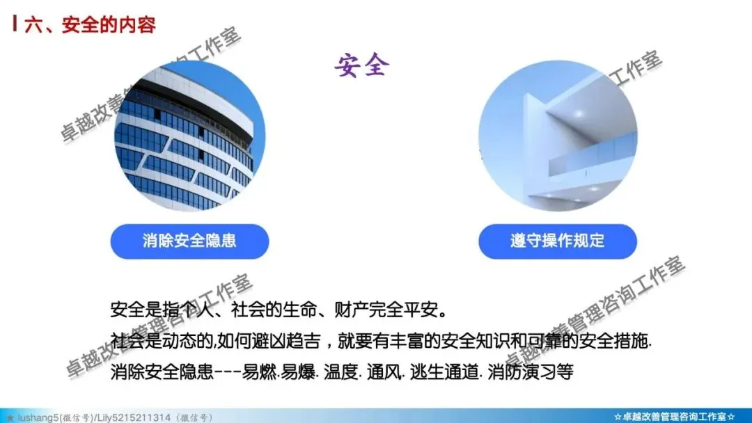 5)素养 + 安全: 培养员工的安全意识与安全行为习惯。如正确穿戴PPE(个人防护装备)、遵守安全操作规程、主动报告不安全状况。