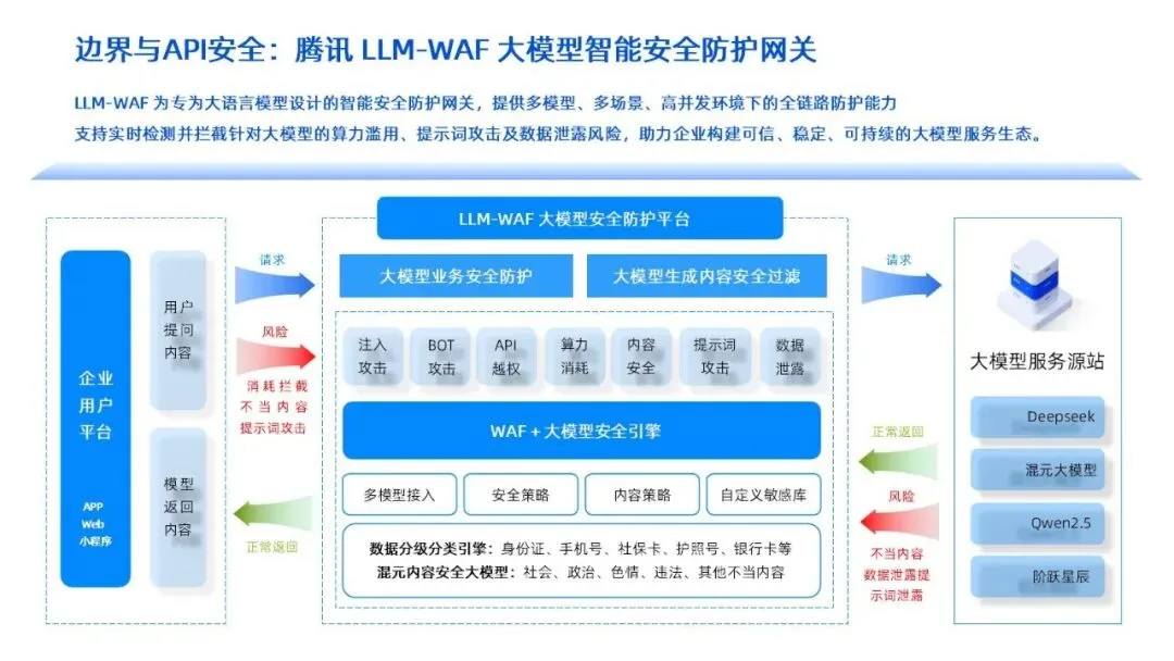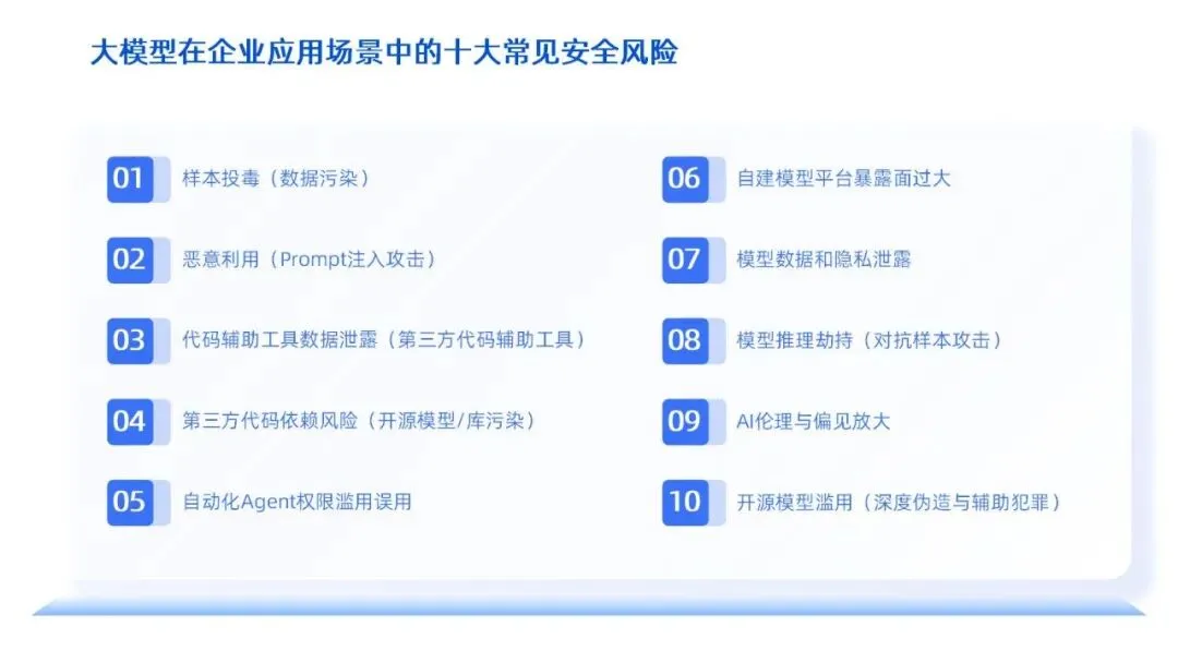 在企业将大模型深度融入业务场景的过程中,往往会遭遇十大核心安全挑战:数据被恶意投毒导致模型决策偏差、模型生成不当内容引发合规风险、员工误用第三方工具导致源码泄露、开源组件携带后门威胁系统安全、Agent权限设置不当导致数据损毁、API接口直接暴露于公网遭受攻击、爬虫技术批量注册扰乱业务秩序、推理过程被对抗样本劫持影响结果准确性、模型伦理偏见被放大引发社会争议、深度伪造技术滥用损害企业声誉。面对这些挑战,CIO们常常陷入“救火队长”的角色,同时还要应对监管机构接连不断的问询与整改要求。