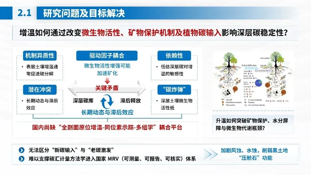 本项目聚焦深层土壤有机碳对增温的响应机制,服务于国家“双碳”目标,针对深层碳库反馈不明、监测困难等核心问题,通过多技术融合与机理研究,旨在揭示碳动态规律并发展可推广的监测与固碳技术。