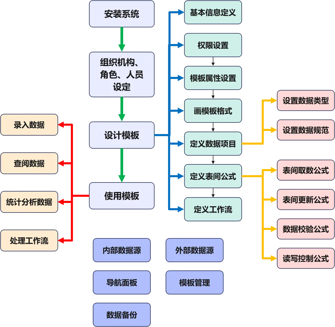 上面图示列示了Myexcel设计和使用的主要步骤。主要流程就是安装系统,设置组织机构、角色、人员,设计模板,使用模板。