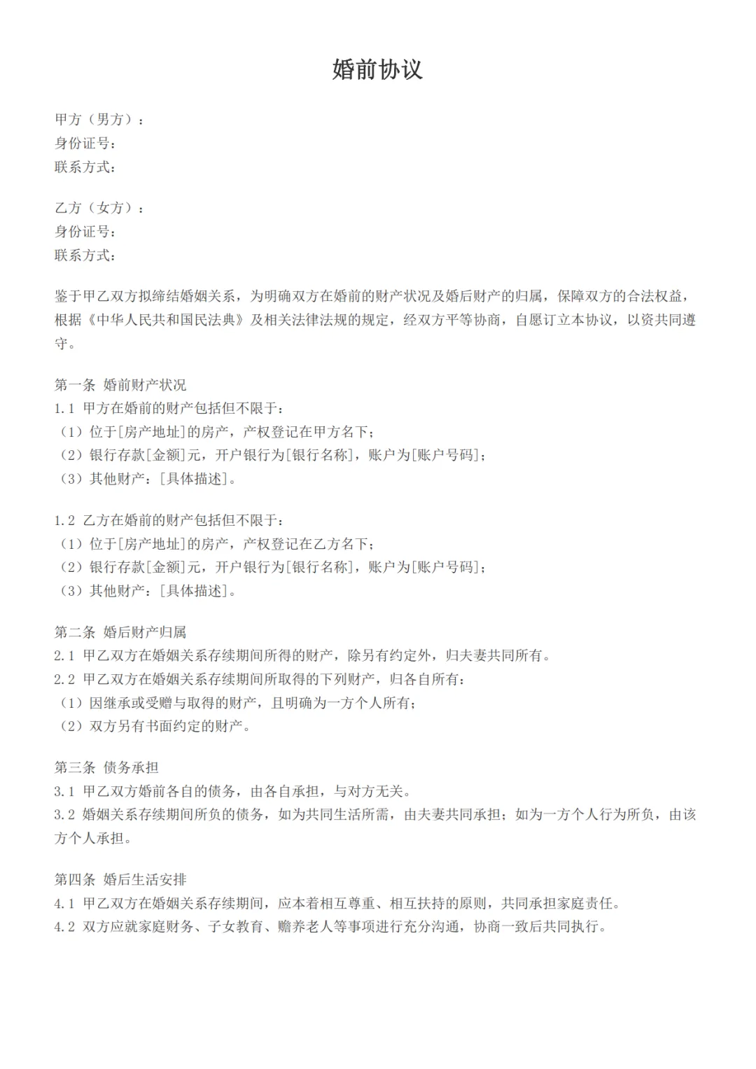 >婚前协议书正规范本,WORD文档电子版,可免费下载打印