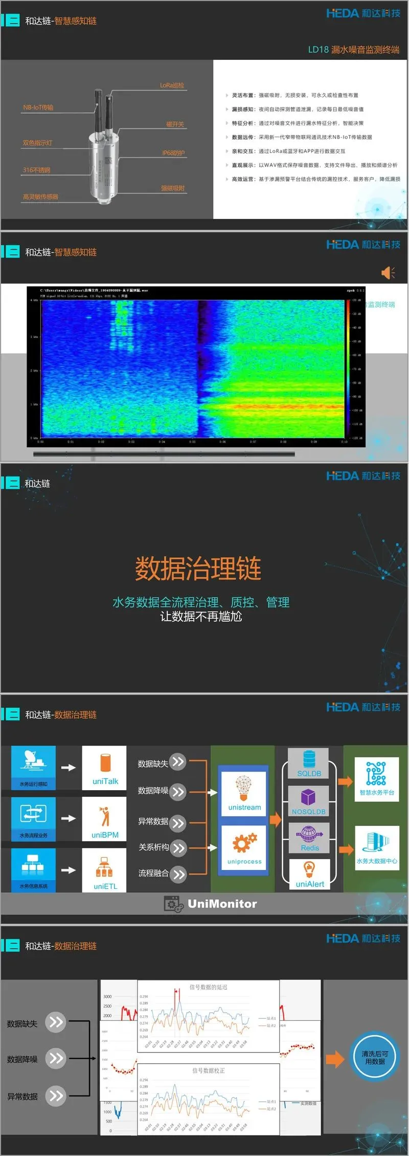 数据感知链是智慧水务的基石。它强调对水循环全流程(从水源、水厂、管网、用户到排水及受纳水体)的水量、水压、水质、水温乃至漏失噪音等参数进行全面感知。文件特别介绍了其LD18漏水噪音监测终端,该设备具备灵活布置、智能漏损感知、特征分析、NB-IoT远传数据等特点,为高效漏损控制提供了强有力的工具支撑。