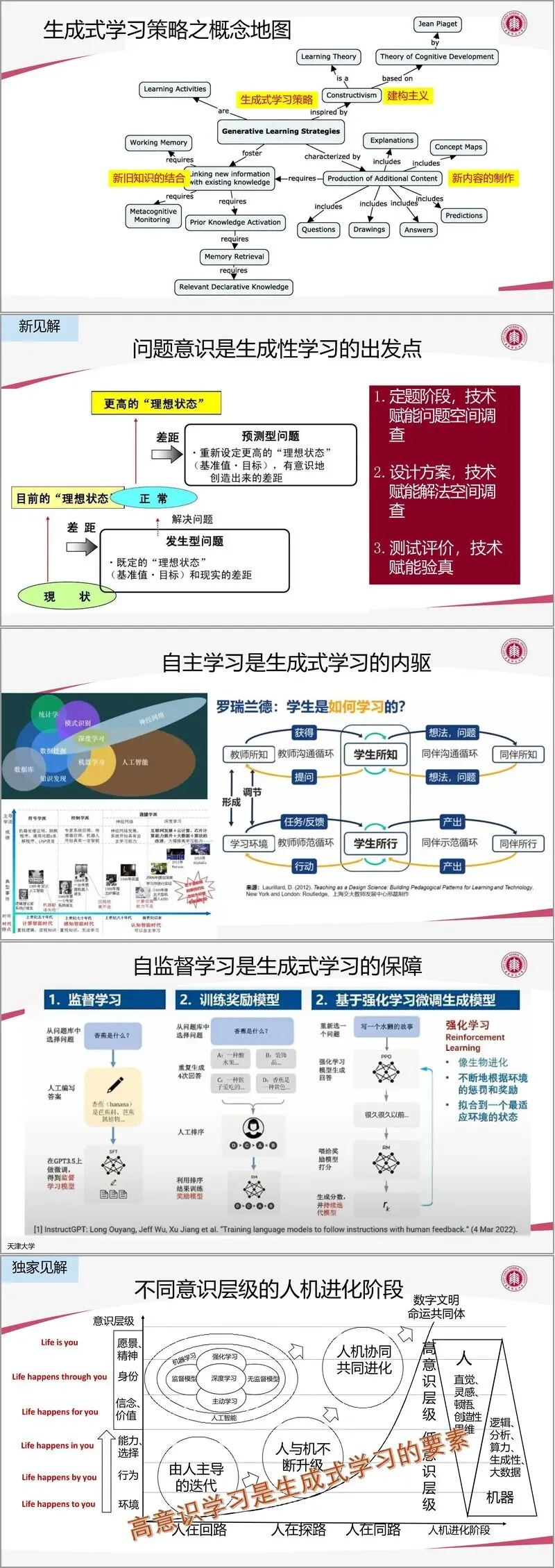 祝智庭提出“高意识学习”理念,强调学习者的主体性、问题意识与协同意识。他认为,人工智能虽在分类、聚类等思维技能上表现卓越,但人类的意识能动性仍是其不可替代的核心优势。高意识学习需经历四个发展阶段:从环境感知到行为实践,再升至能力构建与价值认同。在此过程中,AIGC可通过生成式学习理论(如SOI模型)助力学生实现知识内化,而自监督学习机制则能保障学习过程的自主性与持续性。罗瑞兰德的学习模型进一步阐明,技术应服务于“调查—设计—验证”的闭环,推动学习从知识消费转向知识创造。