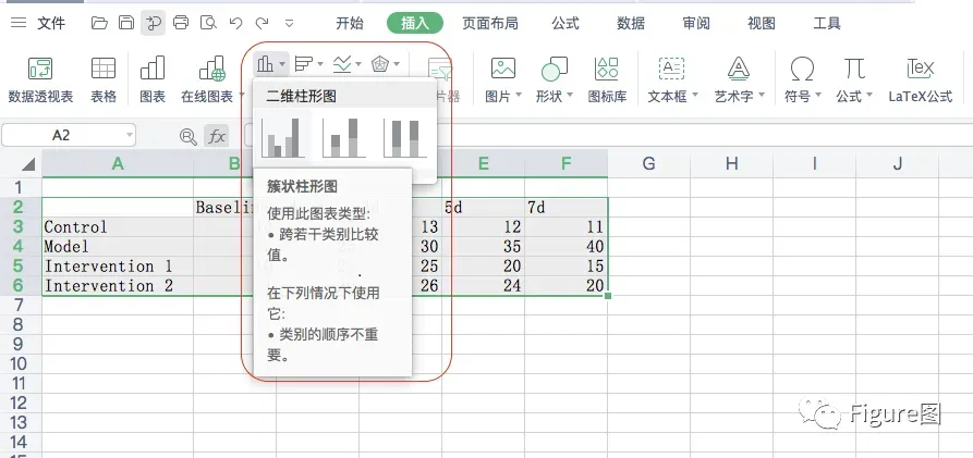 2. 选中数据,依次选择“插入”→“二维柱形图”→“簇状柱形图”,插入图表。