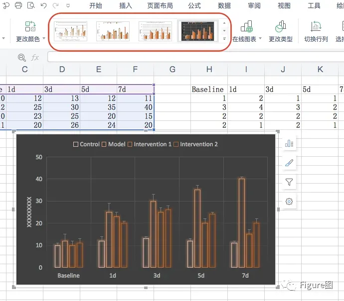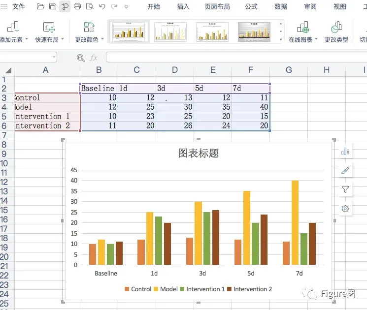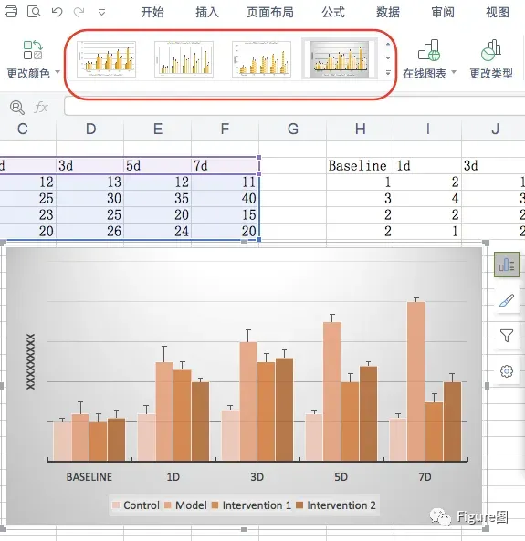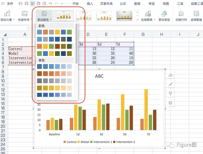 4. 更改颜色:选中图表,点击菜单栏的“更改颜色”,选择相应颜色即可,多色及单色均可。
