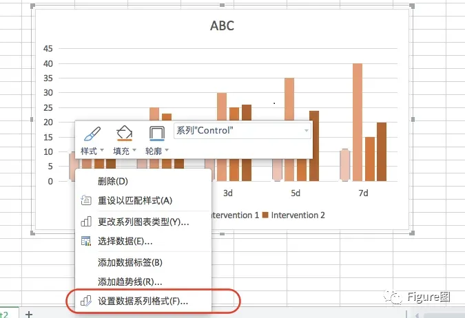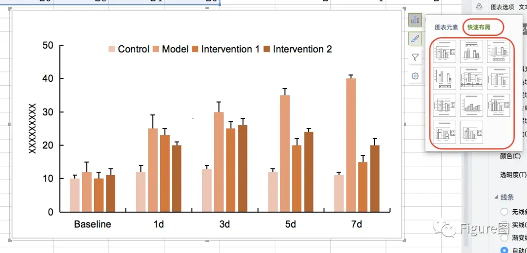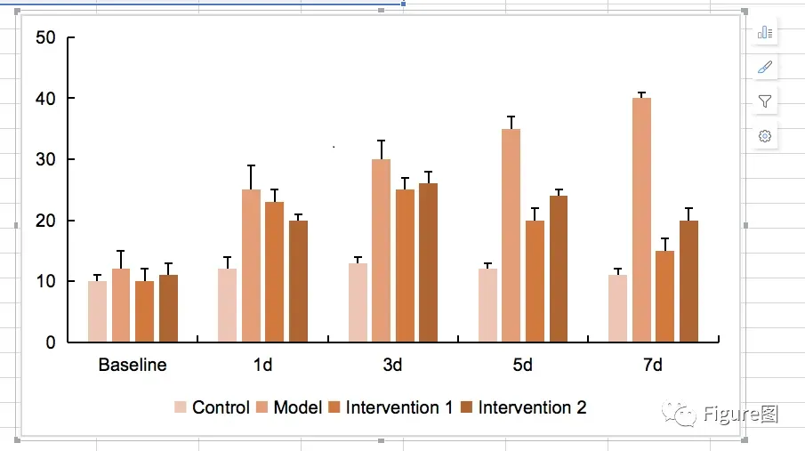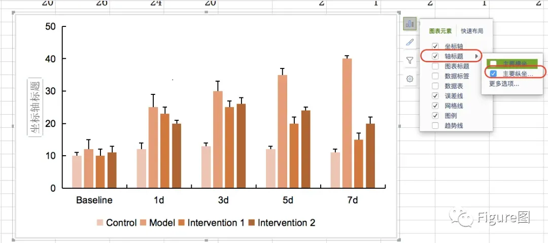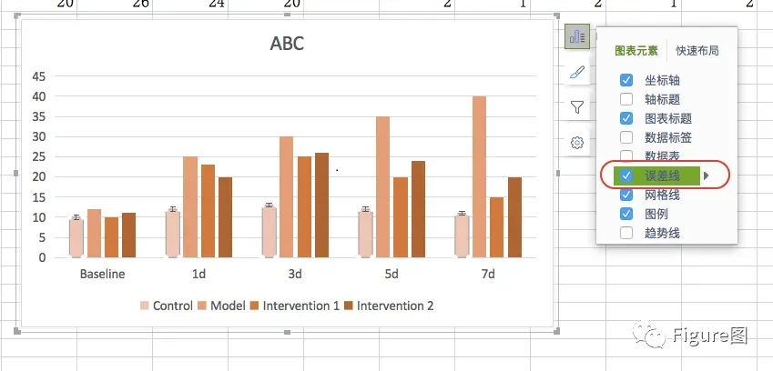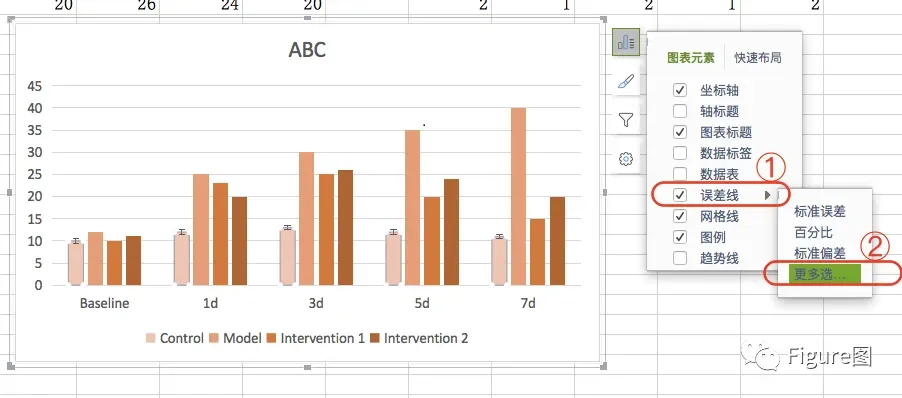 6. 当数据以均数±标准差形式出现时,我们需要添加相应的“误差线”。选中相应的数据系列,在其右侧第一个小图标“图表元素”中勾选“误差线”→“更多选项”。