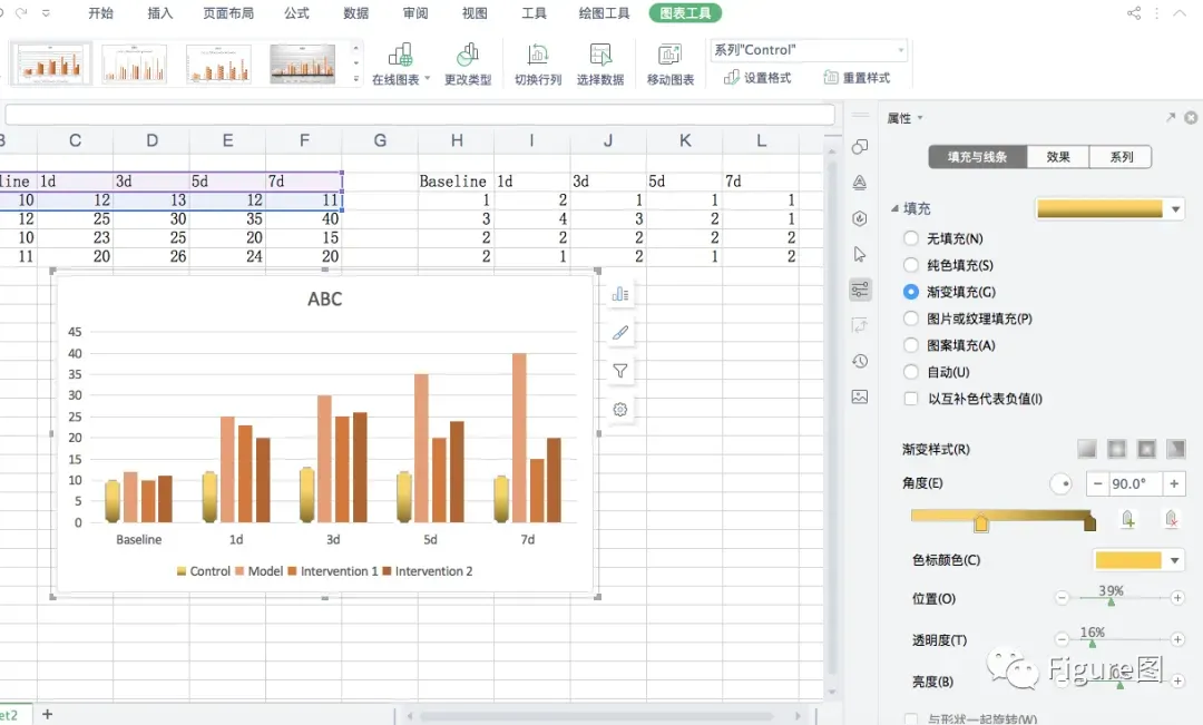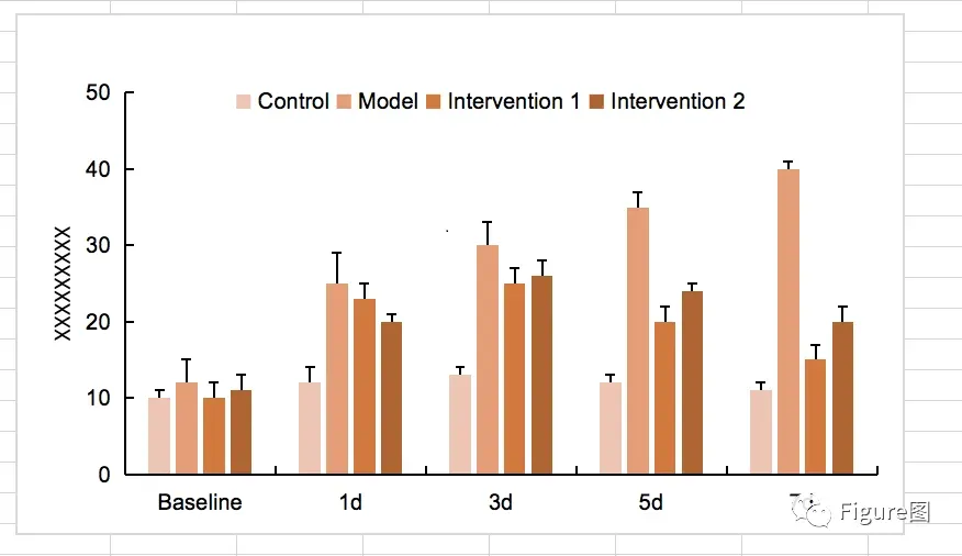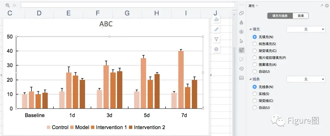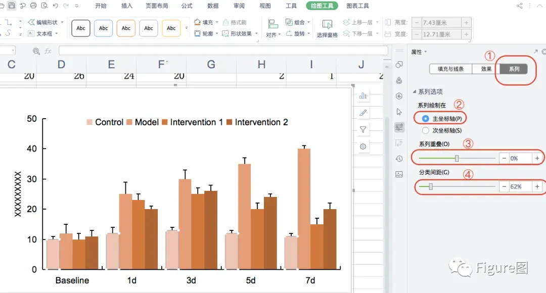 17. 补充二:调整柱子的大小、间距等,选中其中一个系列即可,右侧“属性”→“系列”→“系列重叠”→“分裂间隔”,其中系列重叠为调整不同系列之间的距离(此处为每个时间段内4个组之间的距离),数值越小重叠越小,数值越大间隔越大;而分类间距为调整横坐标上不同类型之间的间距(此处为baseline,1d,3d,5d,7d不同时间段之间的距离),数值越小相互距离越近,数值越大分隔间距越大。