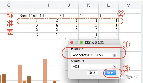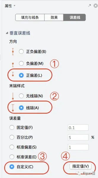 7. 再次选中相应系列上方的误差线,于右侧菜单栏“图表工具”→“属性”→“误差线”→“垂直误差线”→“末端样式”→“误差量”依次操作,其中“误差量”选择“自定义”→“指定值”,在弹出的“自定义错误栏”中的“正错误值”处,点击右侧小箭头图标,框选相应系列的标准差数值,点击“确定”。