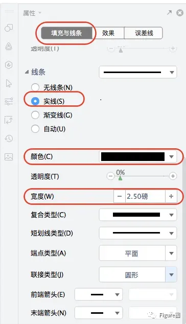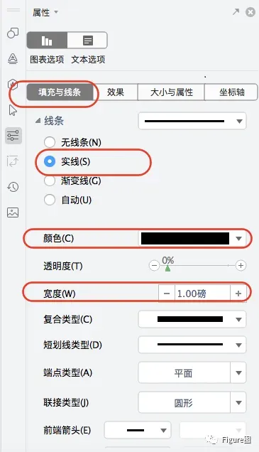 8. 同时选择“填充与线条”对误差线的格式进行调整,如“线条”、“颜色”、“宽度”等。