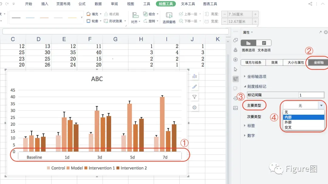 10. 调整X轴、Y轴格式:选中右侧“属性”→“坐标轴”→“刻度线标记”→“主要类型”→选择“内部”、“外部”等。