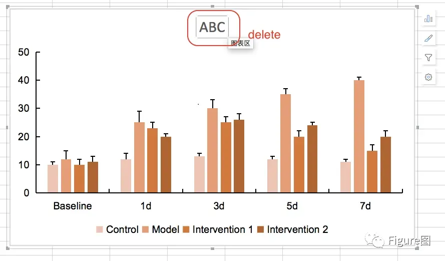 13. 调整图表中的相关元素,首先标题,如不想要,可以选中后直接“delete”,如果需要,就在文本框内修改即可。