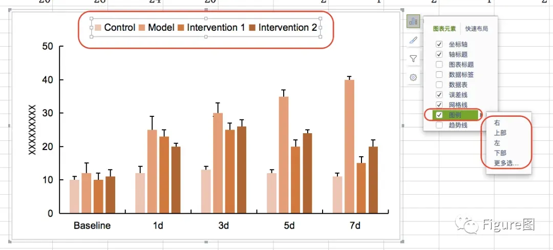 15. 更改图例位置,选中图例后,点击“图表元素”→“图例”,选择具体位置,此处选择上方。