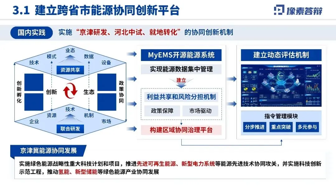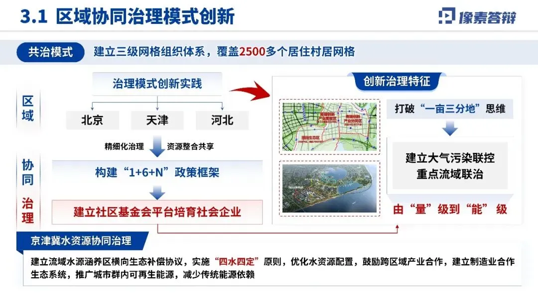 突出 “三地一盘棋” 特色,用示意图展示京津冀环境监测数据共享平台运行机制。重点阐述跨区域生态补偿、排污许可联动等制度创新,结合天津港新能源运输、雄安新区海绵城市等示范工程,体现 “技术 + 制度” 双轮驱动。量化展示成果转化成效,如技术推广应用覆盖率、减排贡献度等,强化项目的可复制性。