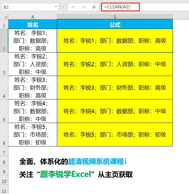 CLEAN函数可以删除所有换行符,一次性完成将数据整理到一行展示。