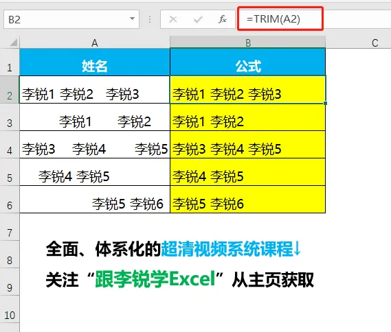 A列数据的前面、中间、后面都有若干空格,要求删除多余空格,仅保留姓名之间的必要空格。