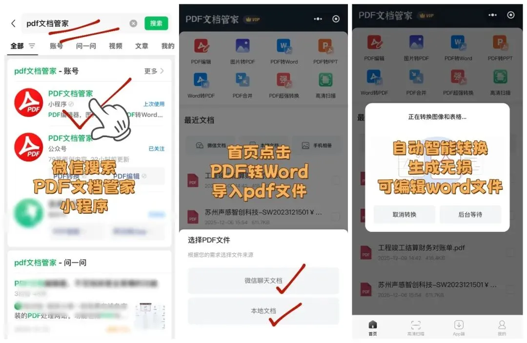 ① 微信打开 PDF文档管家 → 选择【超强转换】