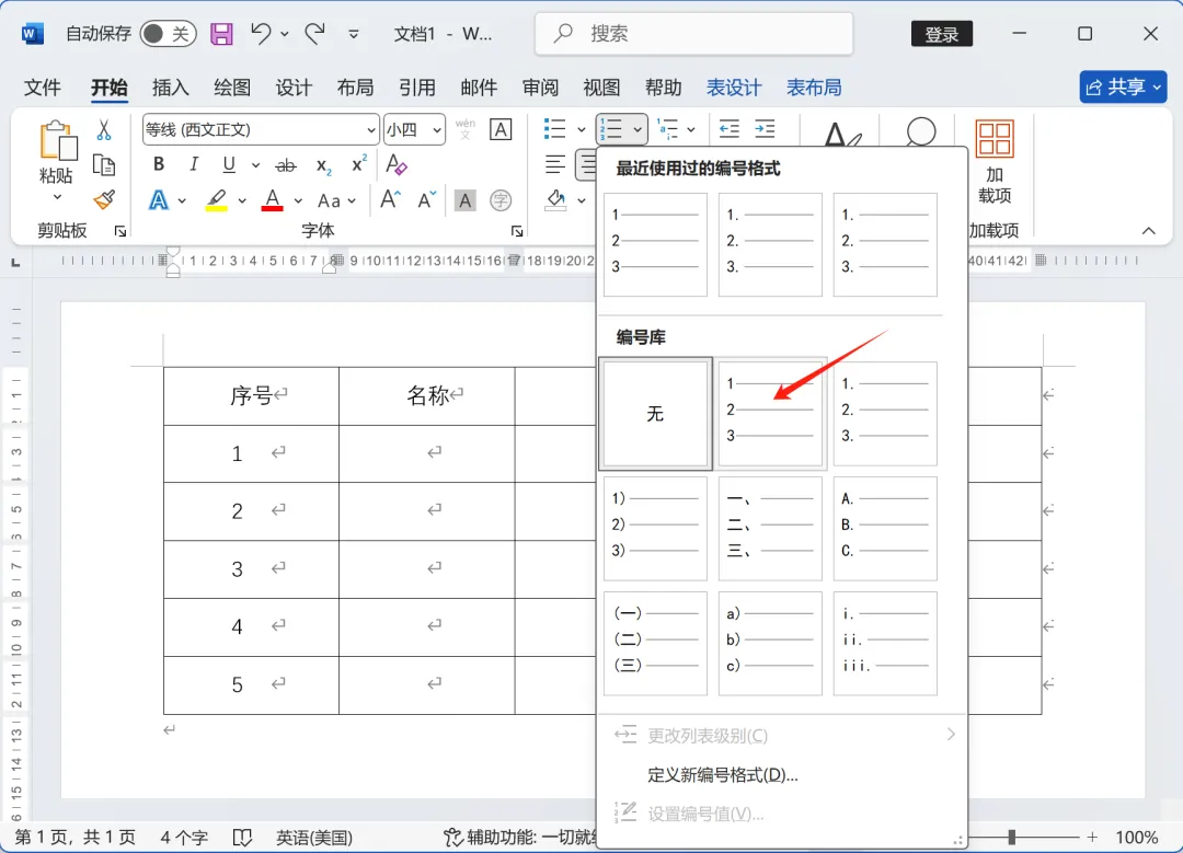 - 从下拉菜单中选择一种编号格式(如1、2、3或a、b、c等)。