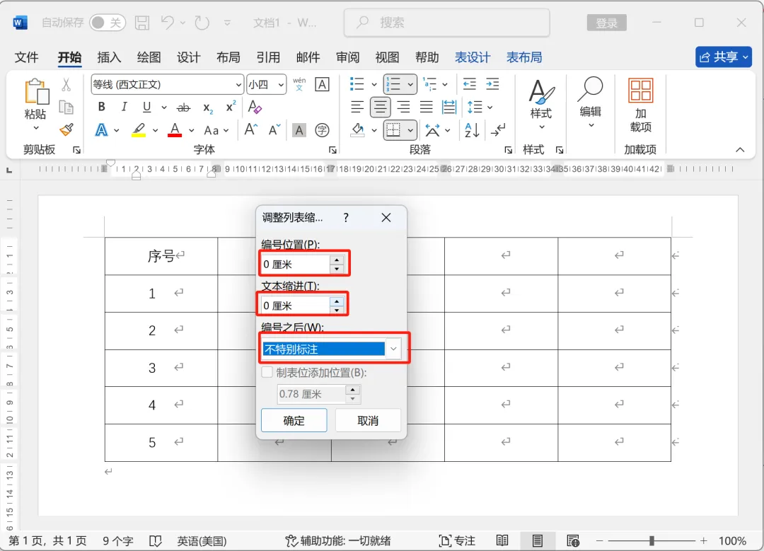 默认情况下,插入的编号可能不会完全居中或对齐,因此需要进行二次调整。