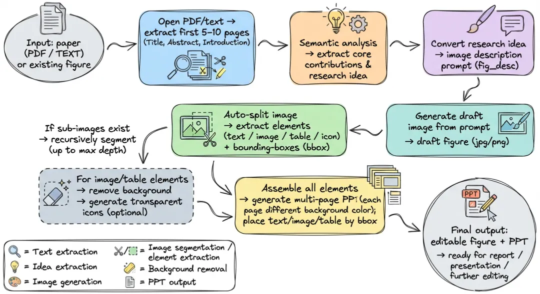 为了让科研配图及汇报演示变得更加轻松、自动化,北大 DCAI 课题组 基于自动化数据治理Agent框架DataFlow-Agent推出了全新的科研绘图与PPT制作辅助平台Paper2Any,实现了完整的自动化 workflow —— 用户只需上传文章内容(支持多模态输入,包括PDF文件、文本及图像),系统就能自动“读资料 → 理解逻辑 → 生成图像 → 切割/提取图文元素 → 输出SVG / PDF+可编辑 PPT格式”。从逻辑到图像,从草稿到最终可编辑文件,生成全流程自动化。快速体验地址: