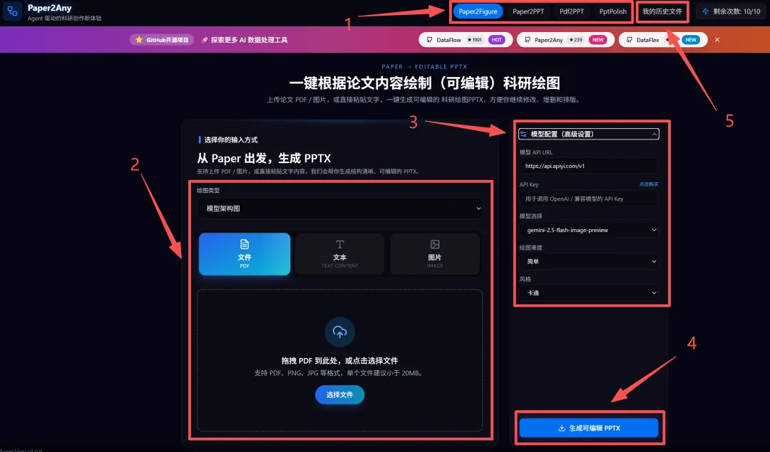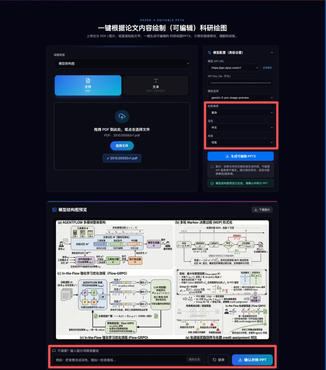 上传论文 PDF 文件/图片/文本,根据选择的绘图难度(简单/中等/困难),此功能可以自动提取模型架构信息,生成对应复杂度的可编辑 PPTX 格式模型架构图。