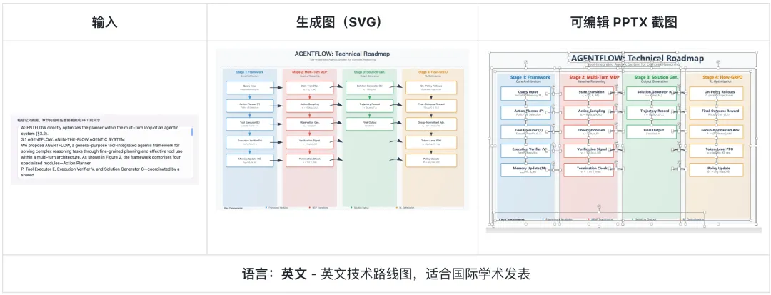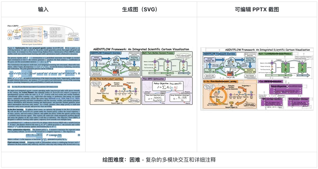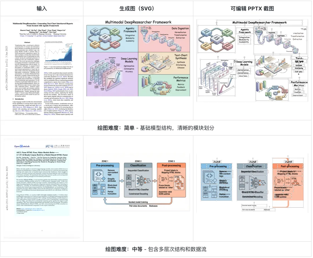 该模块具备强大的多模态输入处理能力,即便是随手绘制的草图或示意图截图也能作为输入源,支持输入PDF文件、文本、图片等多种格式。在此基础上,用户还可以根据实际需求,自由选择生成图片的绘图难度等级与风格倾向,实现高度定制化的创作体验。其生成的内容包括 SVG 图片以及可编辑的 PPTX 格式绘图,用户可以对生成的线条、文字、色块等进行调整。