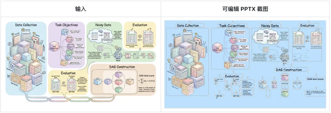更进一步,系统会对这张草稿图进行图文内容分割 —— 自动识别其中的文字、图表、结构模块、图标/子图等,并记录每个元素的位置和类型。这样生成的 “图 + 元素 metadata” 并不是一张 png 图像,而是一组独立可操作的图文、图标或表格块。用户可以在 PPT 中自由移动、编辑、替换、重新布局 —— 获得可编辑且结构清晰的科研图 + 演示文档。