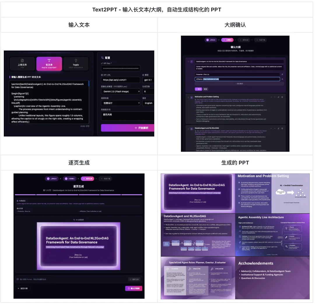 Text2PPT:长文本 → 文本内容总结与展示 PPT输入长文本/大纲,系统可自动生成结构化的 PPT。