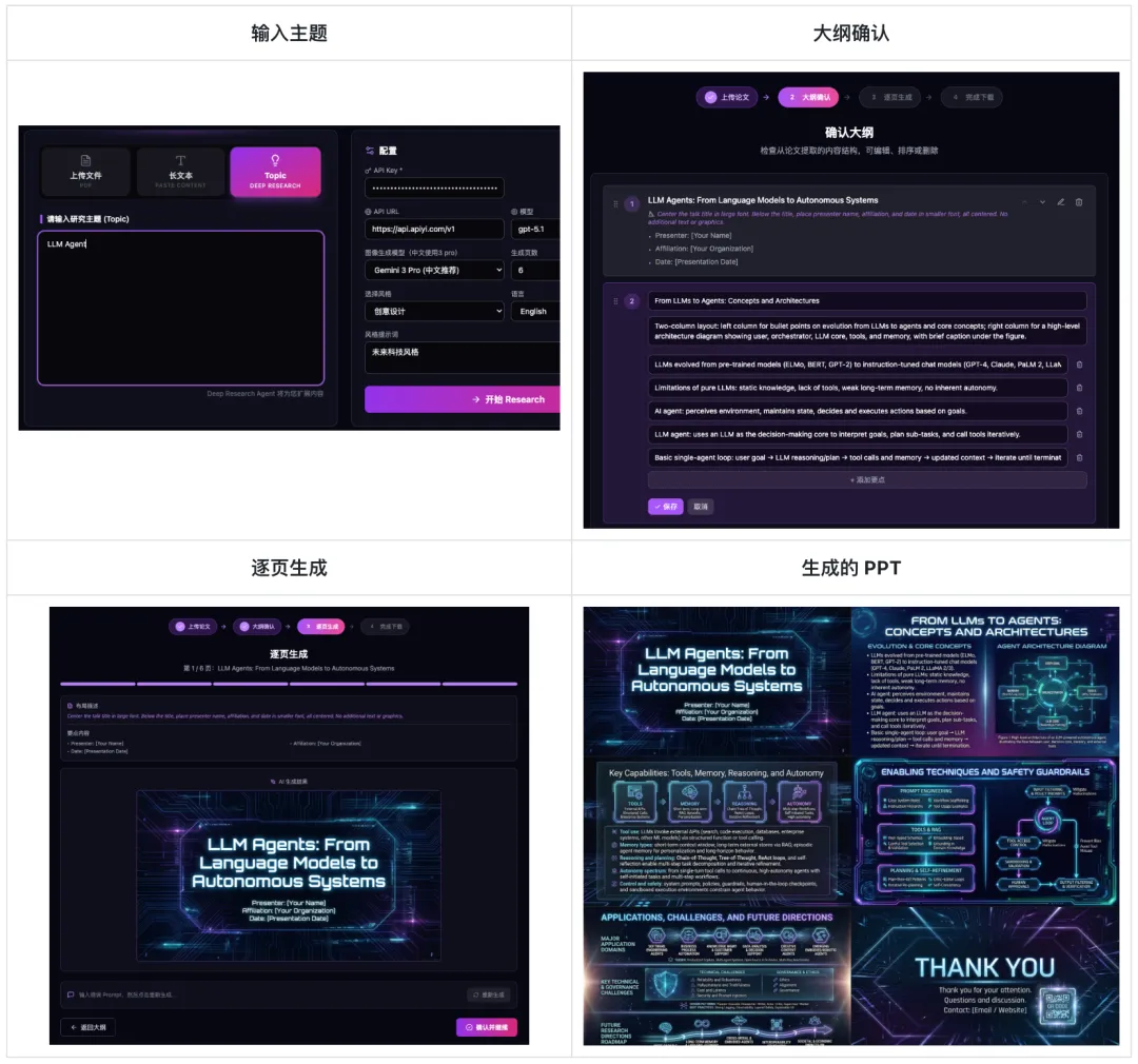 在此基础上,系统将自动生成合适的版面布局,并依托 PaddleOCR 技术对文字层进行重建,确保生成的内容并非简单的截图,而是完全可编辑的文本。用户不仅可以自定义幻灯片页数、风格及中英文语言,还能实现图表的自动化提取与排版。最终,系统支持一键输出精心编写的 PPT(暂时仅支持输出PDF格式,可使用PDF2PPT功能将其转换为可编辑PPTX),免去了繁琐的 Prompt 调试与手动截图排版过程。