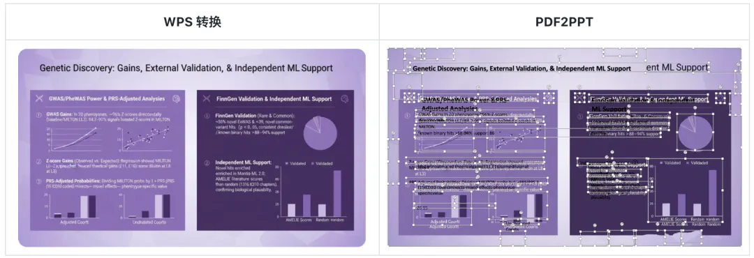 上传论文 PDF /实验结果截图或表格,自动抽取关键数据并生成可编辑的实验数据图 PPTX,同时提供常规和精美两种风格,便于论文和汇报复用。
