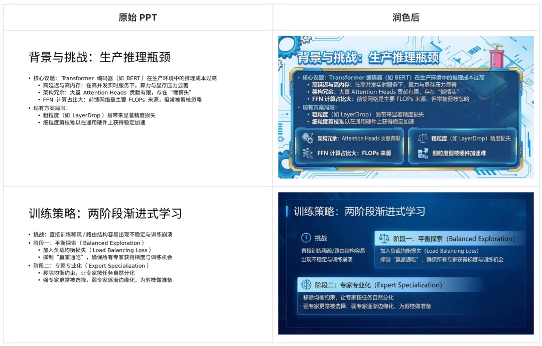 系统可对纯文字或简易空白 PPT 进行智能润色,自动生成精美排版与视觉元素。