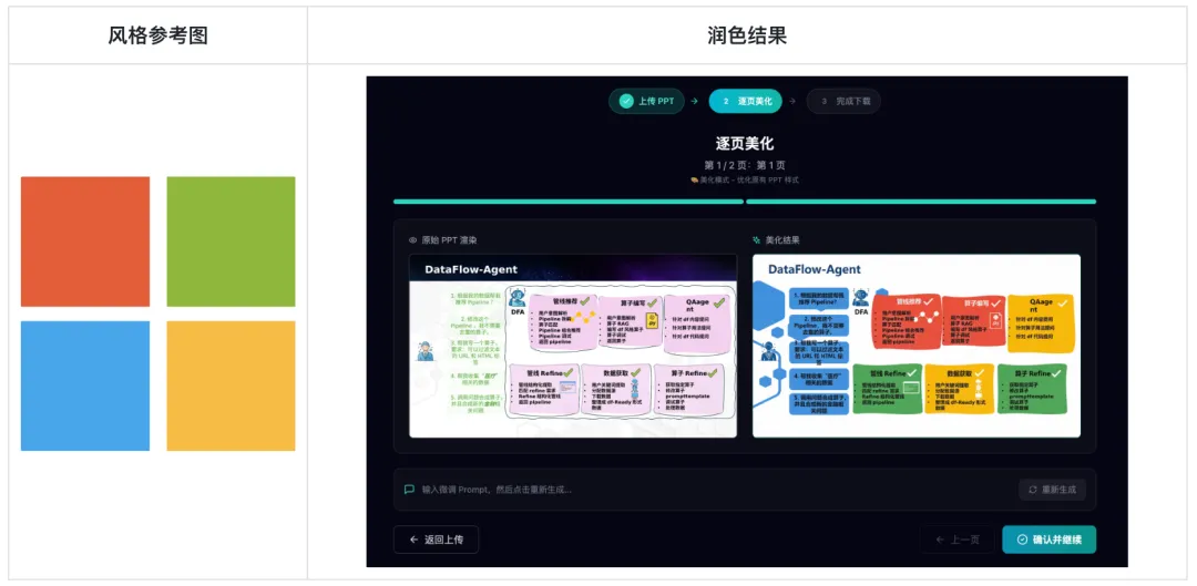 PPTPolish 模块聚焦于对现有 PPT 文档的深度精修。系统会先对用户上传的 PPT 进行逐页解析,并为每一页自动生成对应的美化提示词;用户可在此基础上自由调整提示词内容,再按页执行定制化美化。通过这种“逐页可控 + 可迭代优化”的方式,美化过程更透明、更可编辑,适合需要反复打磨、追求细节质感的正式汇报与高质量演示场景。与此同时,模块同样支持风格参考图功能,用户上传任意风格图片,即可让 PPT 的视觉呈现保持一致。