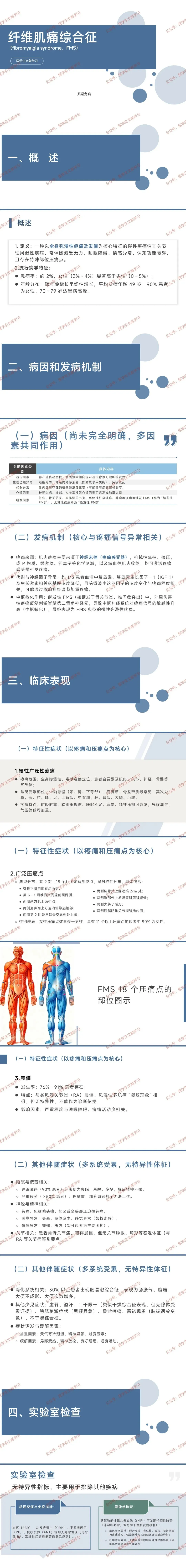 - 定义:一种以全身弥漫性疼痛及发僵为核心特征的慢性疼痛性非关节性风湿性疾病,常伴随疲乏无力、睡眠障碍、情感异常、认知功能障碍,且存在特殊部位压痛点。