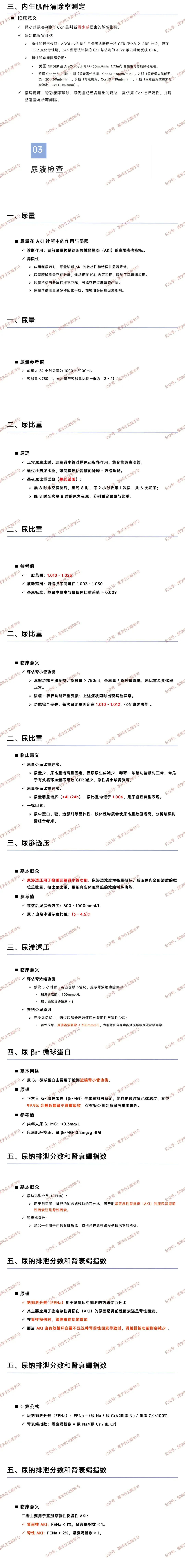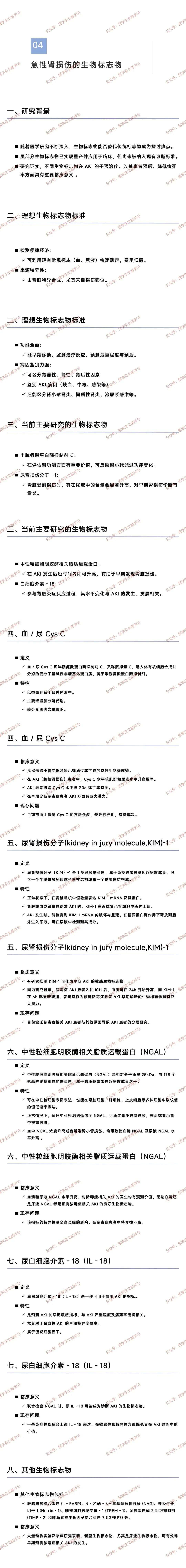 | 血 / 尿 Cys C(半胱氨酸蛋白酶抑制剂 C) | 人体有核细胞合成的低分子量蛋白质,属半胱氨酸蛋白酶抑制剂 | | 提示肾小管受损及 GFR 下降,AKI 时较 Cr、BUN 升高更早,与 AKI 患者 30d 死亡率相关,对脓毒症 AKI 早期诊断有潜力 | |