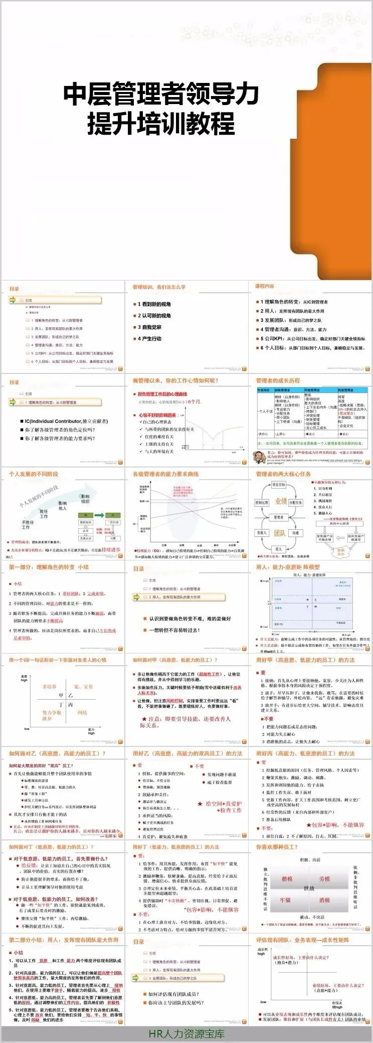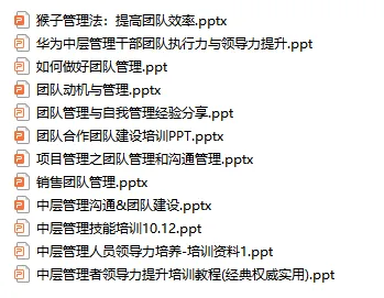 本套资料合计12份PPT,内容丰富,可修改,可编辑,适合各类中层管理培训场景,拿来即用。